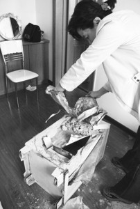 “小偷先將外層鐵皮劃開,然后敲掉里面的混凝土,最后再劃開里面的一層鐵皮。 ”房先生說,“保險柜這么輕易地就能被撬開,這質量也太差了吧,早知道我說什么也不能買啊! ”記者發現保險柜被“剖腹”一側的兩層鐵皮都比較薄,僅有四五張紙厚,用手一撕,就能將鐵皮撕開,此外,散落在地面上的混凝土也非常松軟,用腳一踩,混凝土塊就變成了粉末。